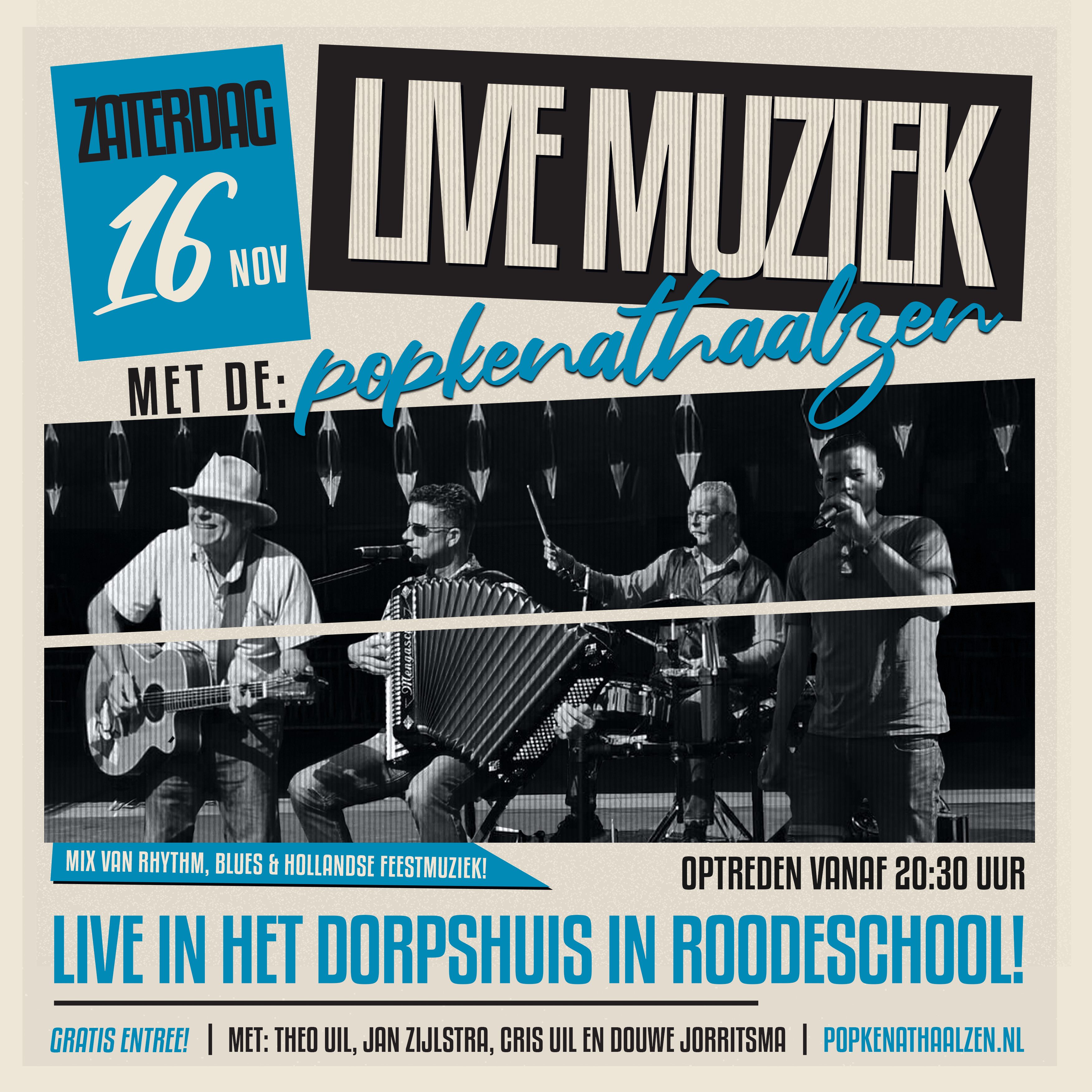 LIVE MUZIEK IN DORPSHUIS ROODESCHOOL! Na lange tijd klinkt er weer livemuziek in ons dorpshuis - en wat voor muziek! De alom bekende Popke Nathaalzen komen het dak eraf blazen! Met trots presenteren we deze geweldige band met leden uit eigen dorp en Uithuizermeeden....